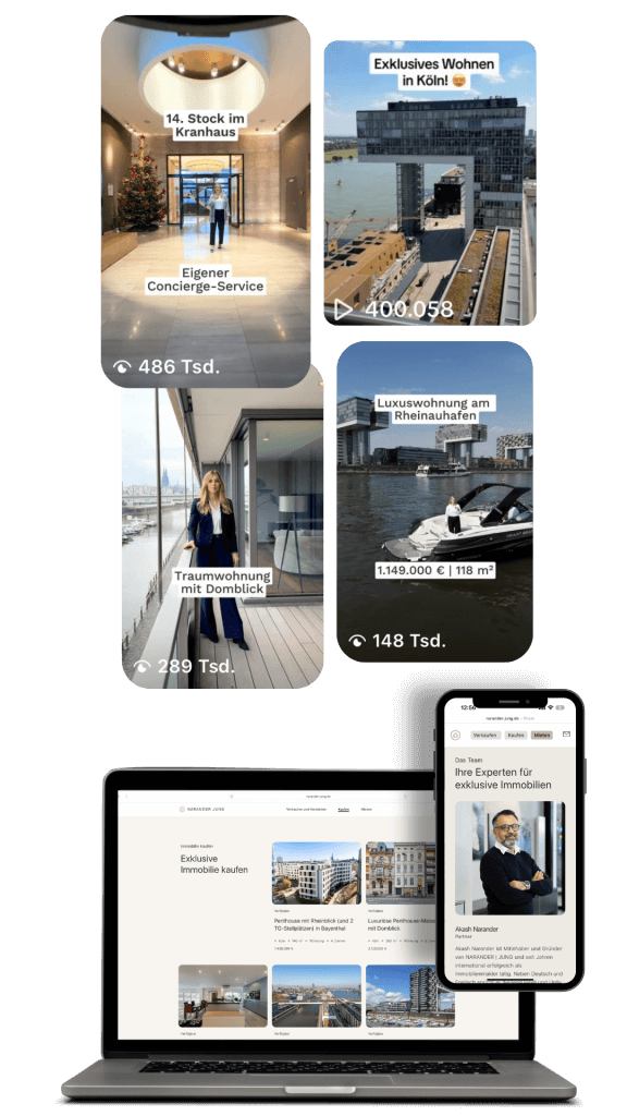 Wir entwickeln eine klare Markenstrategie, stärken die digitale Sichtbarkeit und setzen auf eine konsistente Außenwirkung – insbesondere über Instagram und TikTok. Mit einer authentischen Video-Strategie und standortrelevanten Inhalten konnten wir das Interesse an mehreren Objekten steigern und in kürzester Zeit über eine Million Menschen in Köln und Umgebung erreichen.